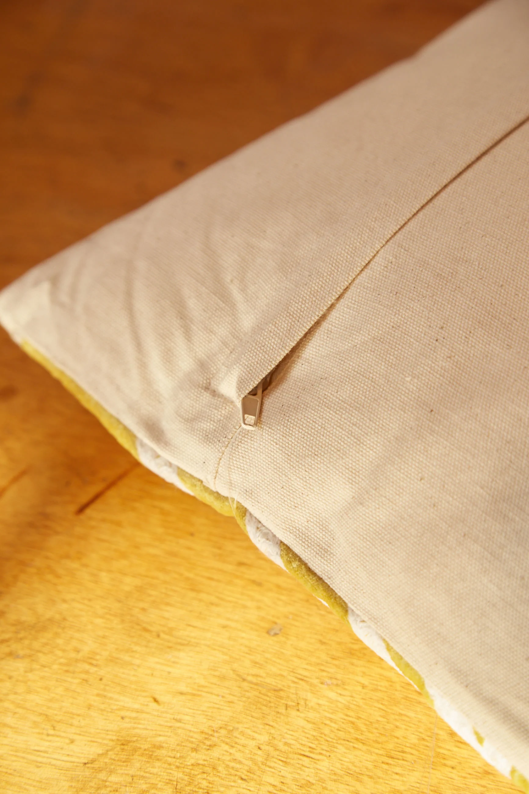 The tufted weaving technique and applique of cotton velvet gives this cushion has almost a 3 dimensional effect. The natural and muted mustard tones are particularly suited to neutral and grey sofas and chairs.