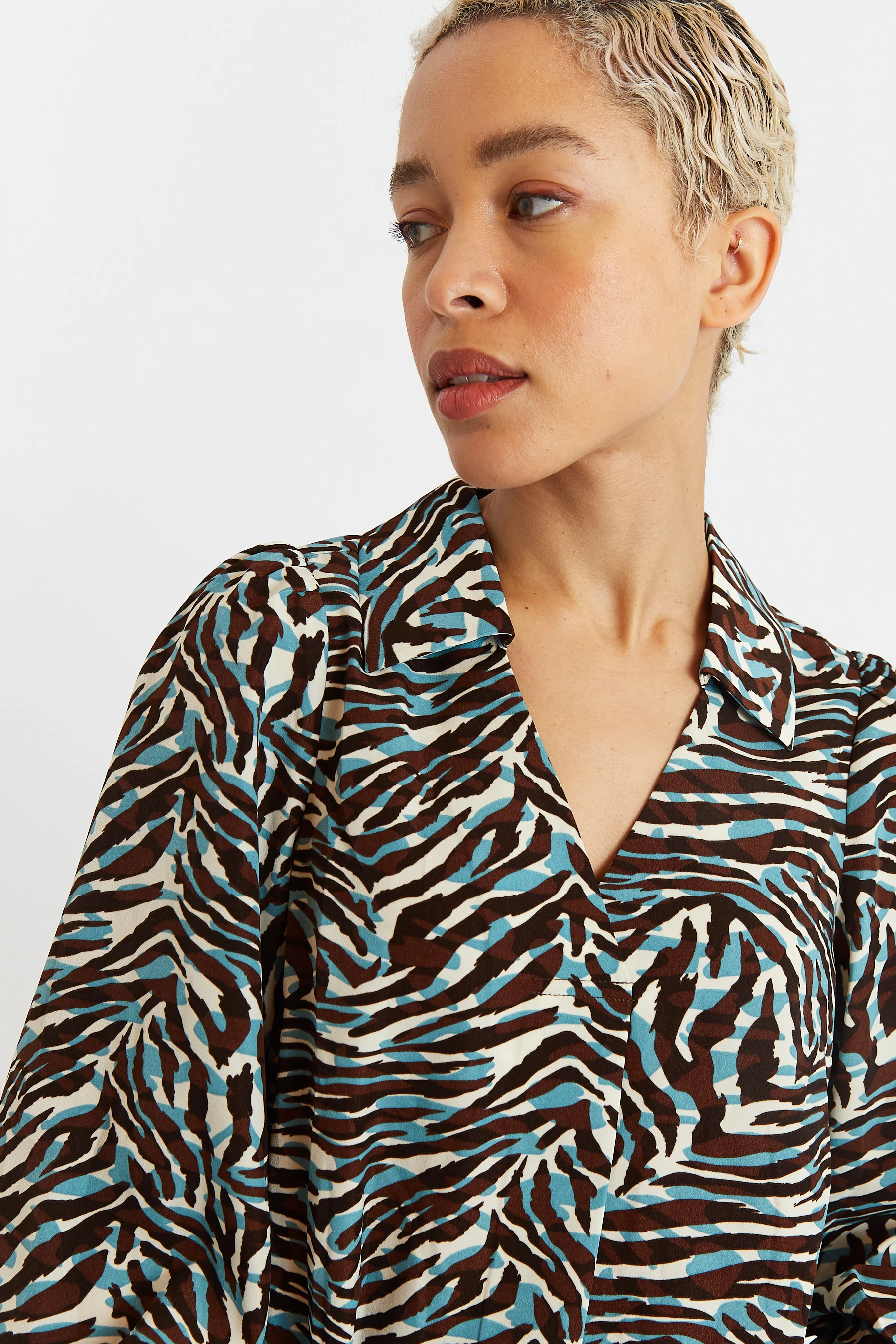 The Debbi Roar Print pop on long sleeve shirt is an easy relaxed fit. Featuring a unique animal print pattern in a distinct chocolate, off white and teal colour combination. Perfect for versatile styling, this shirt is sure to make a statement.