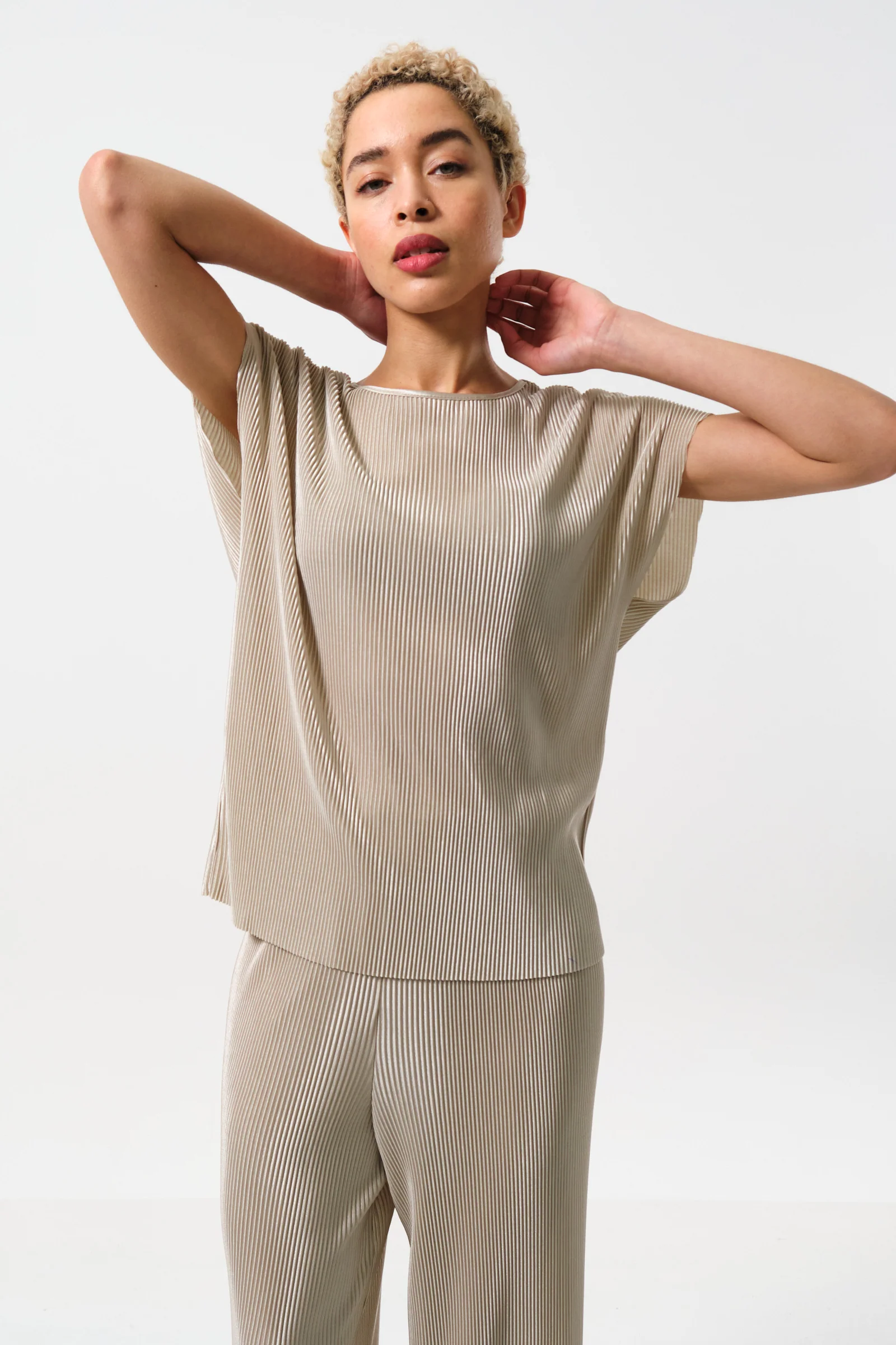 Discover the effortless style of our Korine permanently pleated short sleeve top in stone. With its relaxed fit and elegant design, this top is perfect for any occasion. Pair it with our Clothide trousers for a chic co-ord.