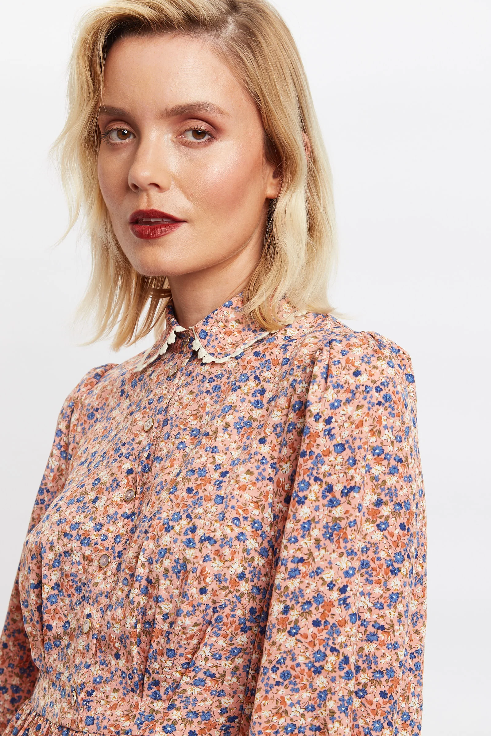 Anda ticks all the boxes for that summer wedding or special occasion that you've been searching for. This midi dress, crafted in our charming dainty ditsy, features billowing sleeves, a tiered skirt, elegant lace trim collar, elasticated waist for definition and comfort, button fastening and our all important side seam pockets