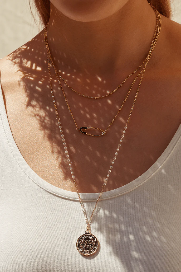 Easily achieve the on-trend layering look with this triple row ode to Punk necklace. Featuring safety pin and coin charms. All suspended from an extendable chain.