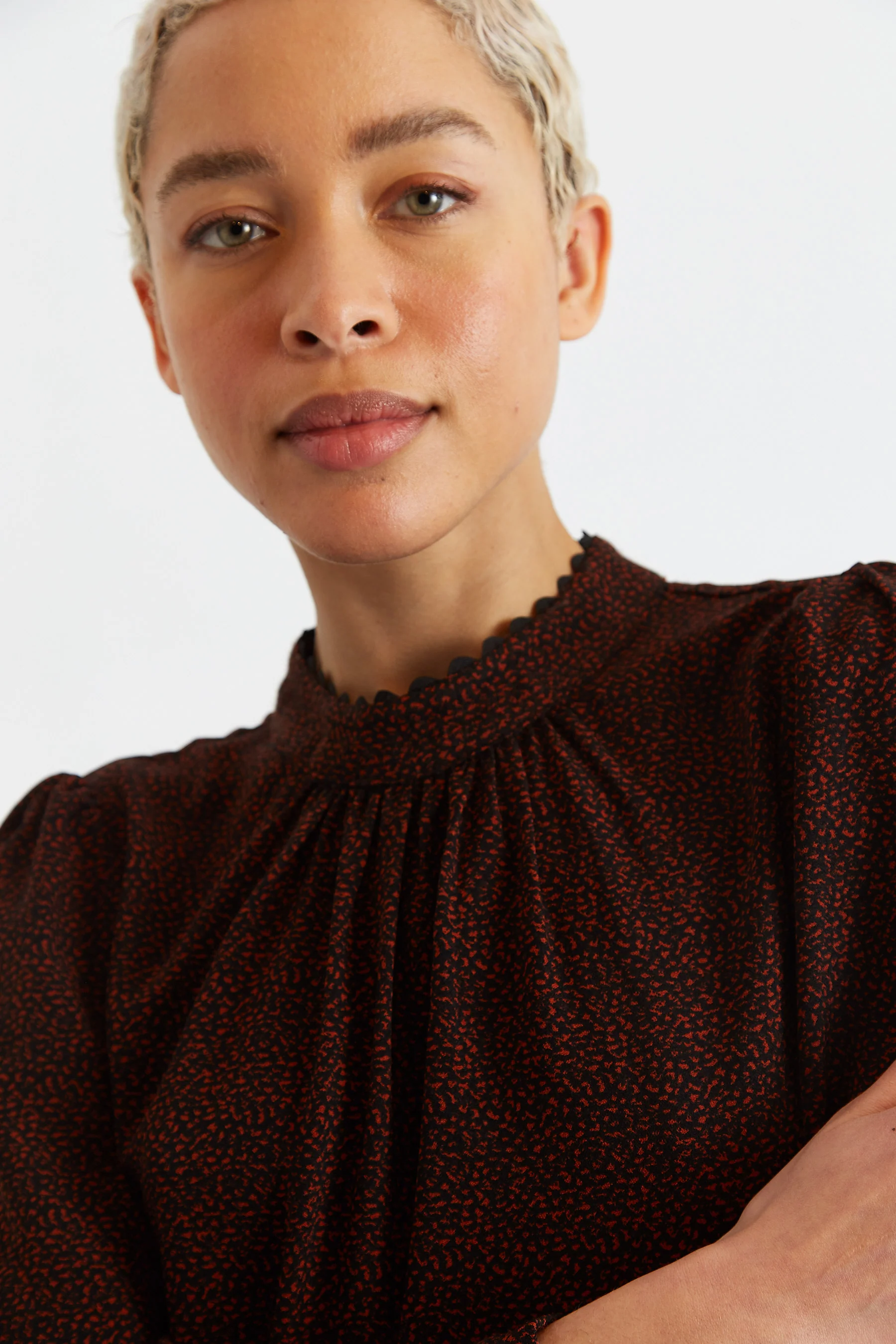 The Luna Freckle print long sleeve blouse is perfect for any occasion. It features a black based minimal print, long billowing sleeves, relaxed fit, and stand collar with ricrac trim to the collar and cuff. Styled here with our Blanche Skirt.